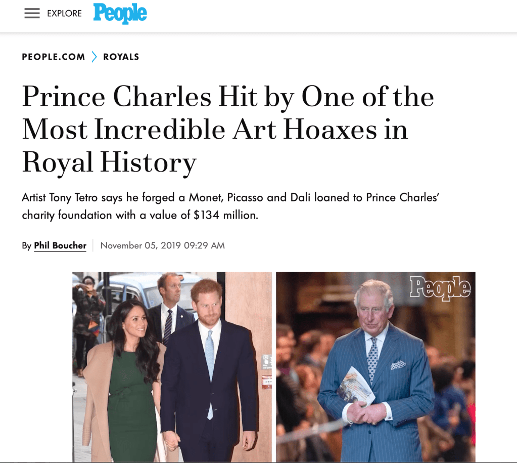 Tony’s art work in Prince Charles’ collection covered by People Magazine. https://people.com/royals/prince-charles-hit-by-one-of-the-most-incredible-art-hoaxes-in-royal-history