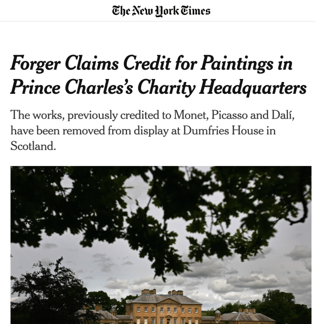 Tony’s Monet, Picasso, and Dali find their way into Dumfries House the stately home that is the headquarters of Prince Charles’ charity headquarters. https://www.nytimes.com/2019/11/04/world/europe/prince-charles-fake-art-dumfries-house.html