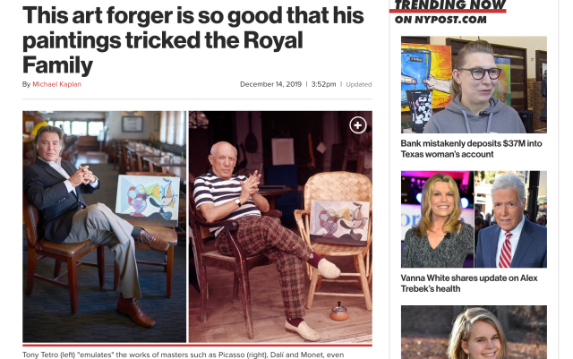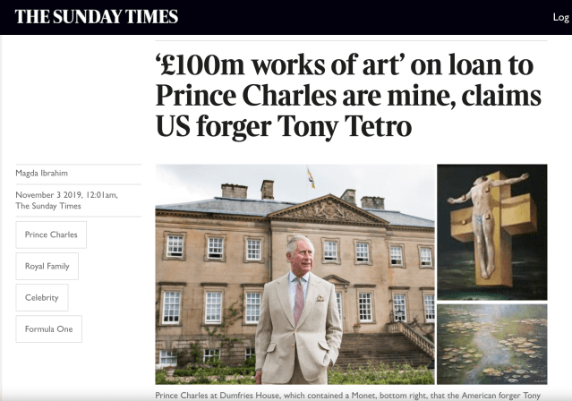 Tony Tetro ranks among the world’s most talented art forgers — as Prince Charles found out the hard way. Three borrowed paintings were loaned for display at Dumfries House, the Scottish estate that is headquarters to the Prince’s Fund charity. https://nypost.com/2019/12/14/this-art-forger-is-so-good-that-his-paintings-tricked-the-royal-family/